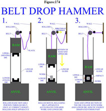 The belt drop hammer is another drop forging machine tool that operates similarly to the board drop hammer. Rollers grip a belt that is connected to the ram. They raise the hammer by the belt, this causes the belt to gain slack. Pulling apart the rollers will release the belt. When the belt is released, the hammer will fall. This type of machine also relies only on the force of gravity.