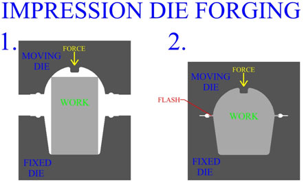 One characteristic of impression die forging manufacture is the formation of flash or fin around the forged part. During the design of the metal forging operation, the volume of the starting work piece is made slightly higher than that of the closed die cavity. As the die close, and the work metal flows into and fills the contours of the impression, some excess material will flow out of the die and into the area between the two die. This will form a thin plane of metal all around the work at the parting line, (where the two die meet when they close), of the forged product. Flash is trimmed from the forging in a latter process.